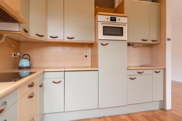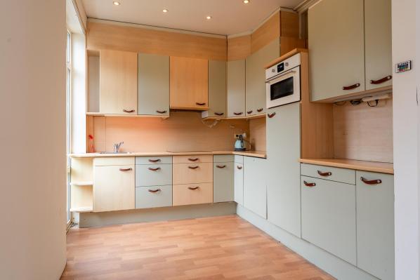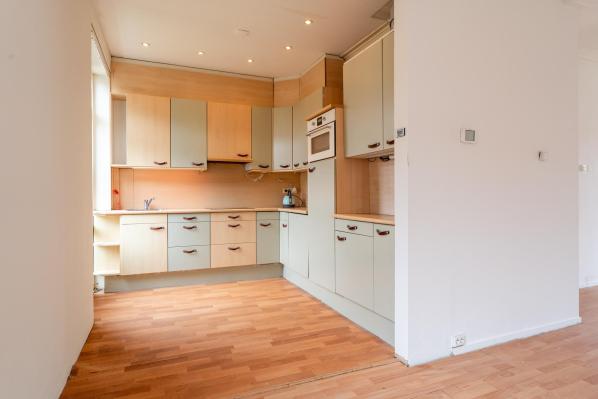 Overloop, tweede toilet met fonteintje, U-vormige woonkamer met open keuken (totaal ca. 50 m2) met deur naar het balkon aan de achterzijde.