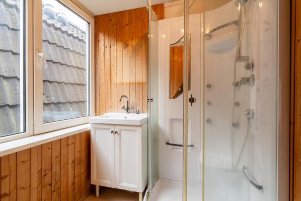 Overloop, 3 slaapkamers, 2e badkamer met douchecabine en wastafelmeubel.