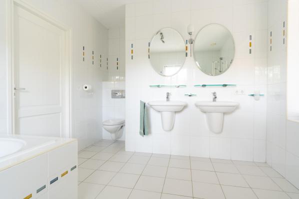 - Ligbad, Toilet, Douche, Dubbele Wastafel, Wastafel