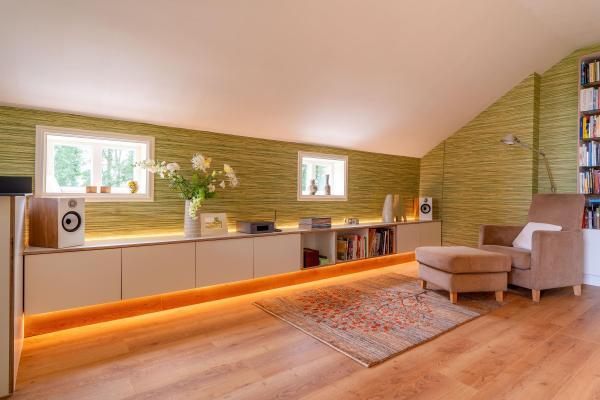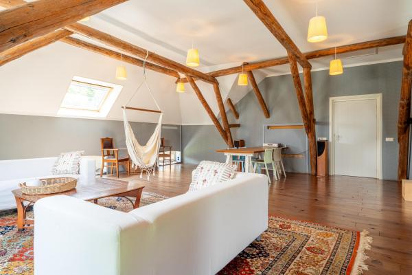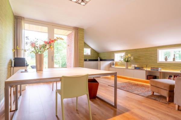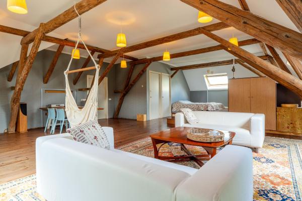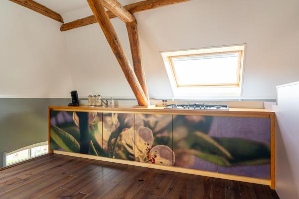 Fraaie loft met eigen ingang, Na de brede overloop is er een apart toilet, moderne badkamer met tweepersoons ligbad en aparte douche, smaakvolle keuken voorzien van enige inbouwapparatuur.