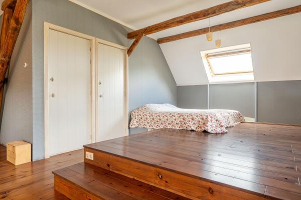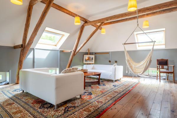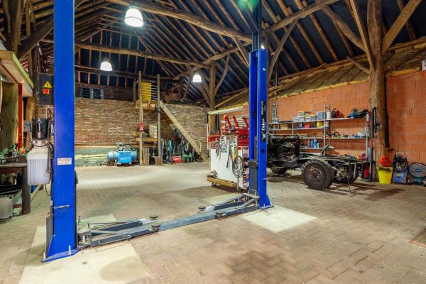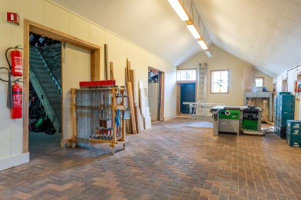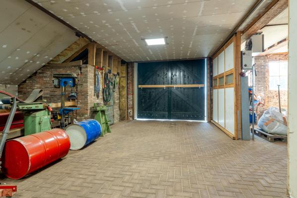 Het inpandige schuurdeel van circa 380 m² biedt een prachtig zicht op de historische gebinten en de vernieuwde houten dakconstructie. Dit deel beschikt over meerdere zolders die geschikt zijn voor zware belasting. Een open ruimte van 100 m² is geïsoleerd, stijlvol afgewerkt en voorzien van krachtstroom, ideaal te gebruiken als atelier, werkplaats of galerie.
