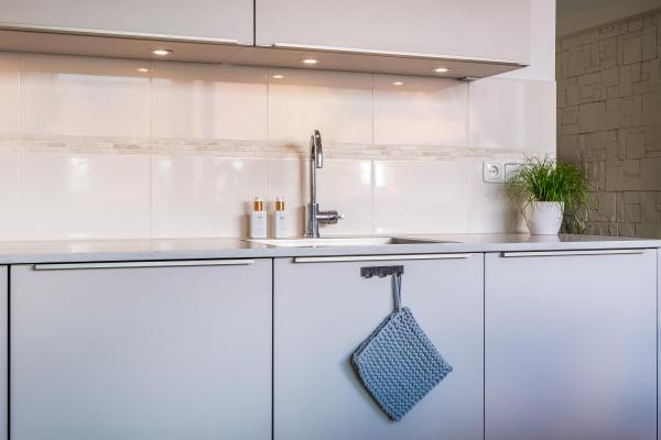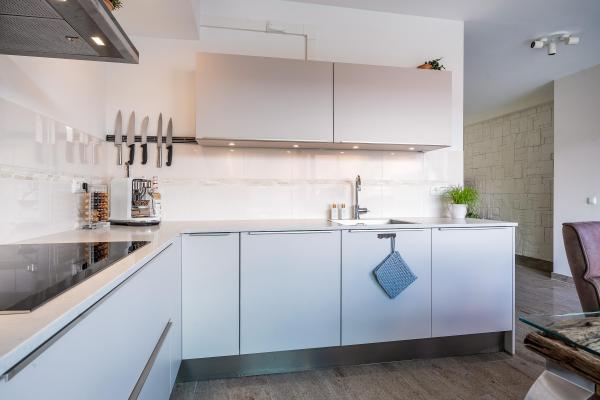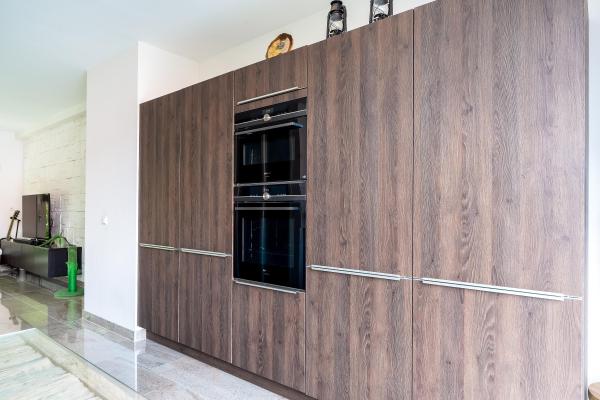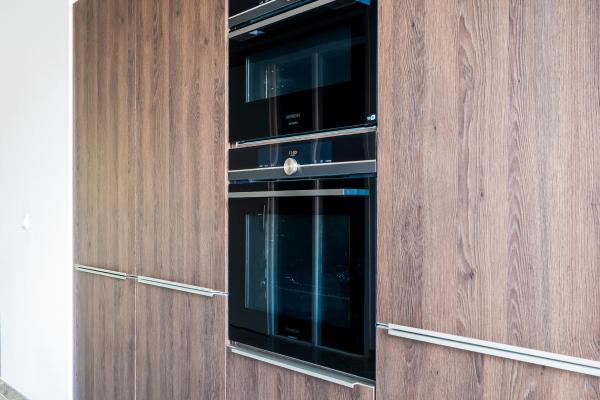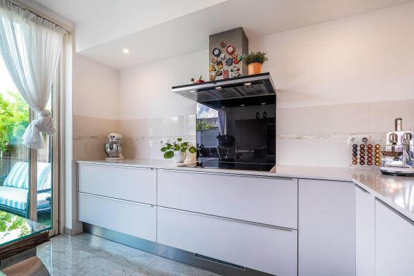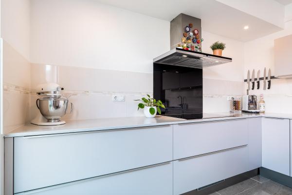 Overloop, L-vormige woonkamer met luxe open keuken voorzien van diverse inbouwapparatuur.