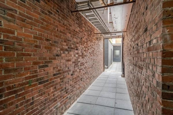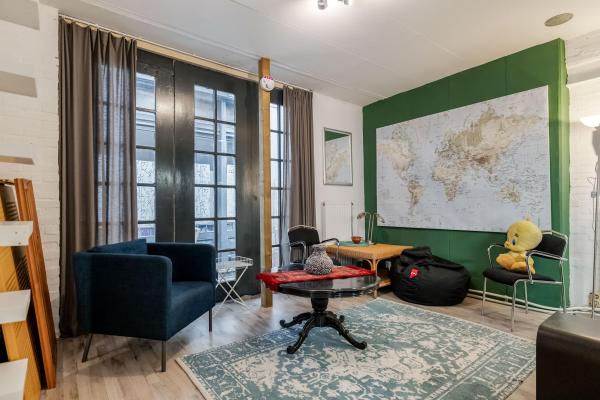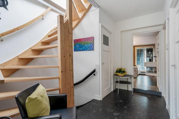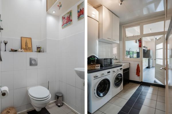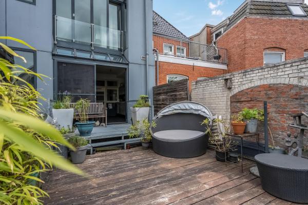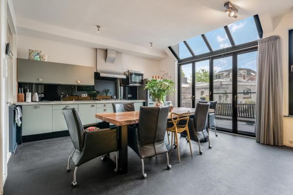 Overloop met toilet en fonteintje. De sfeervolle woonkamer in L-vorm heeft een authentiek balkenplafond, twee originele schouwen waarvan één met houtkachel, en een prachtige erker aan de voorzijde. De aangrenzende woonkeuken is ruim en licht, uitgerust met enige inbouwapparatuur en biedt directe toegang tot het zonnige en beschutte dakterras aan de achterzijde. Tevens vind je hier een aparte wasruimte met witgoedaansluitingen.