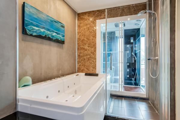 Op deze verdieping bevinden zich drie slaapkamers, waaronder een royale master bedroom met walk-in-closet. Er is voldoende ruimte om een vierde slaapkamer te creëren. De ruime badkamer is voorzien van een whirlpool, douche, aparte stoomcabine, dubbele wastafel, toilet én bidet.