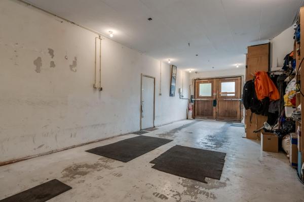 Ruime entree/hal met trapopgang naar de woonverdieping. Aan de achterzijde bevindt zich een royale, inpandige garage (circa 4 auto's) met openslaande deuren. Ook bevindt zich hier een bijgebouw met eigen voorzieningen, ideaal voor kantoor aan huis, praktijkruimte of mantelzorg.