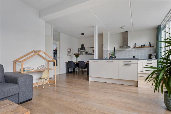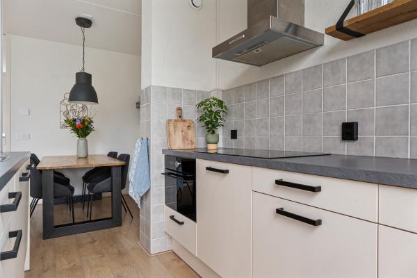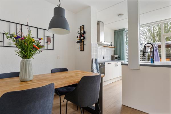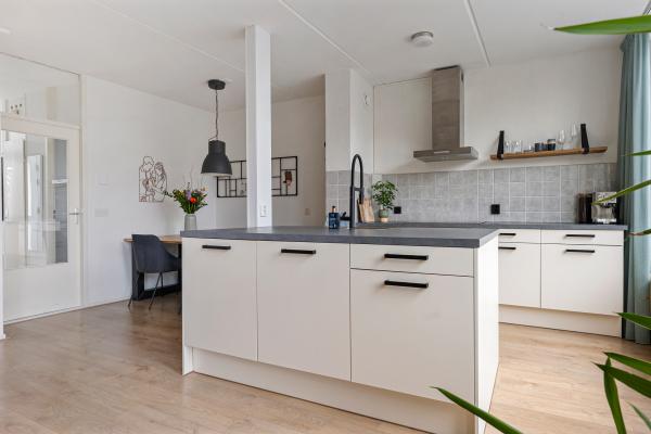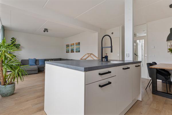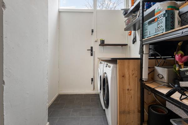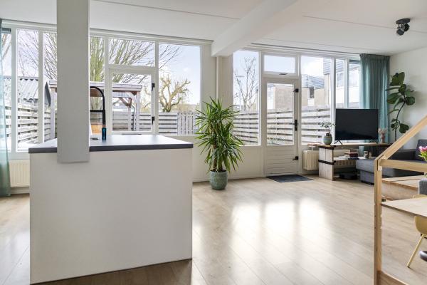 Bij binnenkomst stap je via de hal de lichte, ruime woonkamer binnen, met prachtig uitzicht op de tuin. De moderne open keuken, voorzien van een gezellig spoeleiland en diverse inbouwapparatuur, maakt deze ruimte ideaal om te koken en gezellig samen te zijn. De voormalige inpandige berging is slim omgebouwd tot een praktische bijkeuken met witgoedaansluitingen, ideaal als extra bergruimte en praktisch in het dagelijks gebruik.