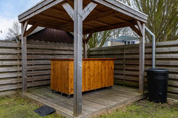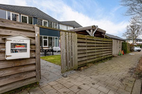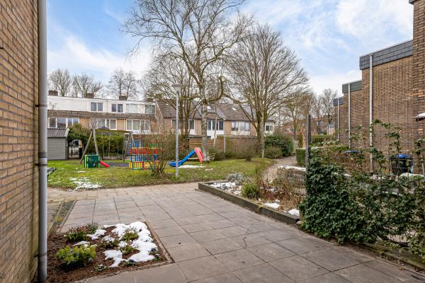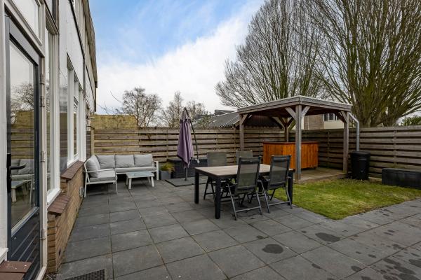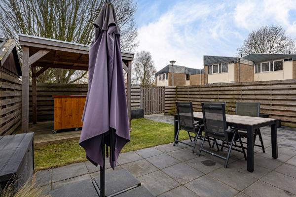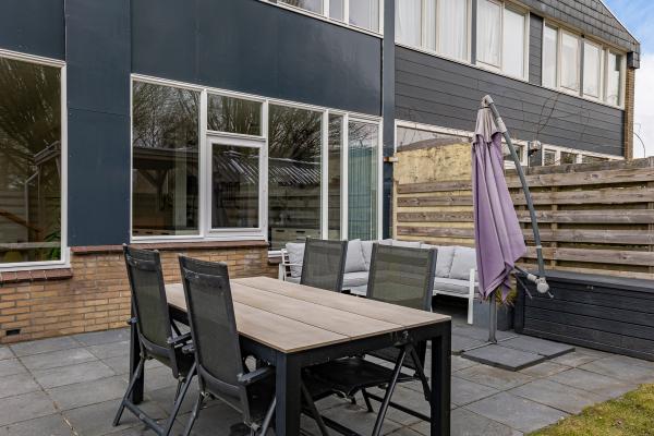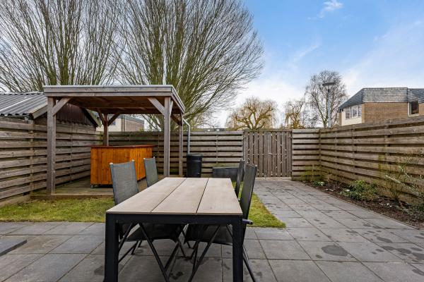 De verzorgde en onderhoudsvriendelijke achtertuin ligt heerlijk zonnig, beschikt over een terras, praktische tuinoverkapping en een handige en brede achterom, wat het extra gebruiksvriendelijk maakt.