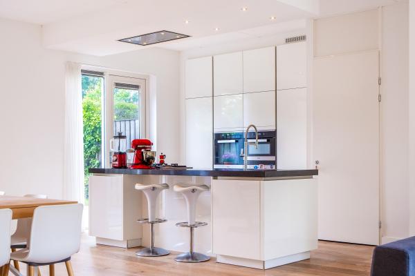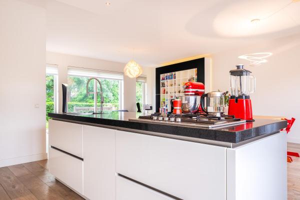 Entree/tochtportaal, hal met trapopgang, toilet met fonteintje, lichte woonkamer met dubbele openslaande deuren naar de tuin, moderne open keuken voorzien van kookeiland en diverse inbouwapparatuur.