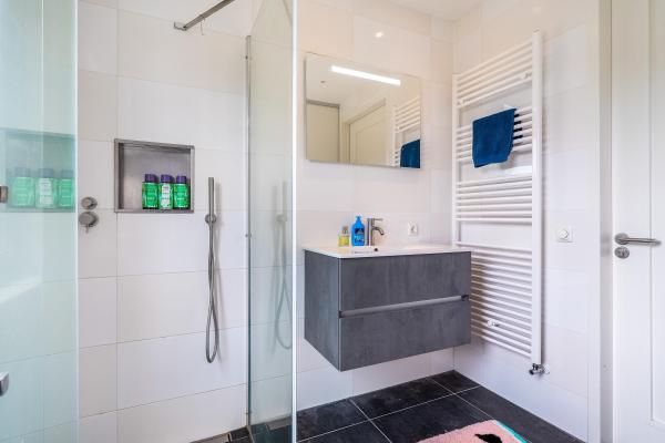 Overloop met toegang tot het dakterras, ruime 4e slaapkamer, 2e badkamer (2020) met douche, wastafel en toilet, wasruimte met cv-opstelling.
