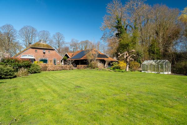 Binnen treft u een verrassend ruime en speels ingedeelde woning. De woonkamer is indrukwekkend van formaat en kenmerkt zich door de hoge plafonds, robuuste balken en de centrale haardpartij die direct sfeer en warmte brengt. De grote raampartijen zorgen voor een prettige lichtinval en bieden een fraai uitzicht over de tuin. Aansluitend bevindt zich een royale zitkamer en een eetgedeelte, waardoor er meerdere plekken zijn om te verblijven, te ontspannen of gasten te ontvangen. De woonkeuken is ruim opgezet en vormt een centrale plek in de woning. Hier beschikt u over volop werkruimte en een gezellige opstelling voor een eettafel. De keuken staat in directe verbinding met de tuin en de overige leefruimtes, wat zorgt voor een praktische en open woonbeleving. Daarnaast beschikt de begane grond over meerdere kamers die naar wens in te delen zijn, bijvoorbeeld als slaapkamer, werkkamer of hobbyruimte. Ook zijn er meerdere sanitaire voorzieningen aanwezig, wat het comfort vergroot. Op de eerste verdieping zet de ruimte zich voort. Hier vindt u 2 slaapkamers, een nette badkamer en een royale overloop die eveneens flexibel te gebruiken is. De kamers zijn licht en bieden volop mogelijkheden voor een gezin of het combineren van wonen en werken. De zolderverdieping biedt aanvullende bergruimte en extra gebruiksmogelijkheden. Daarnaast is er een vrijstaand bijgebouw aanwezig met een oppervlakte van circa 37 m², wat perfect geschikt is als werkplaats, opslagruimte of hobbyruimte. De tuin rondom de woning is een absolute meerwaarde. Met een perceel van deze omvang heeft u alle ruimte om uw woonwensen te realiseren. Of u nu wilt tuinieren, dieren wilt houden of simpelweg wilt genieten van rust en natuur, hier kan het allemaal. De combinatie van groen, privacy en ruimte maakt dit tot een unieke woonplek.
