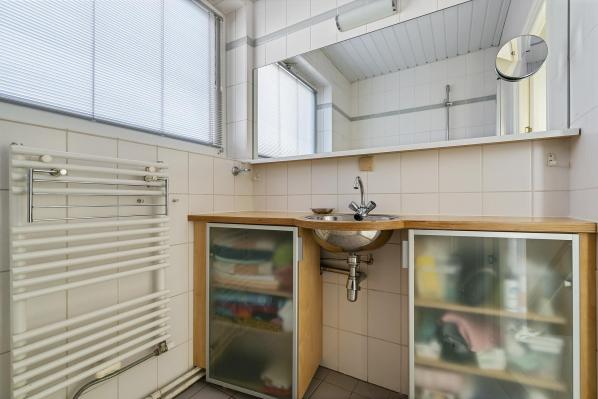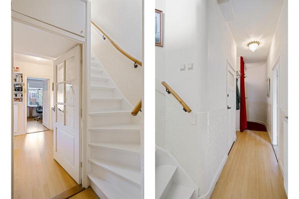Fraaie entree, gang met trapopgang, toilet met ruimte voor wasmachine en droger, sfeervolle woonkamer met toegang tot de achtertuin, dichte keuken met kelderkast en met ook een toegang tot de tuin, en een slaap-werkkamer.