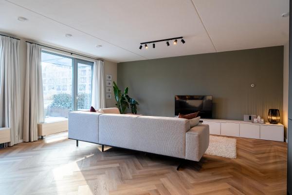 Overloop, lichte woonkamer met openslaande deuren naar het terras en een luxe open keuken voorzien van diverse inbouwapparatuur, wasruimte, 2 slaapkamers, moderne badkamer met douche, wastafelmeubel en wandcloset.