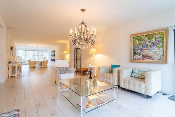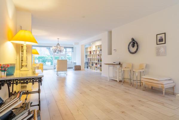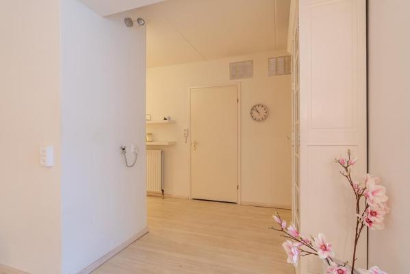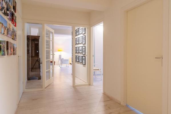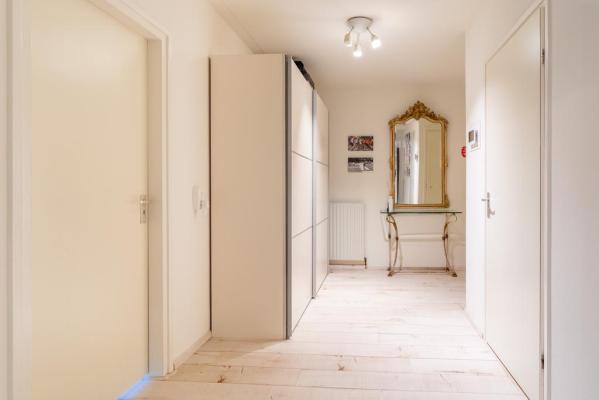 Entree/hal, toilet met fonteintje, living ca. 100 m² met zonnige woonkamer, schuifpui naar het terras aan de achterzijde, deels open keuken voorzien van alle inbouwapparatuur, bijkeuken met wasmachine en drogeraansluiting, 2 royale slaapkamers resp. ca. 19 en 13 m² en een moderne badkamer met inloopdouche en dubbele wastafel.