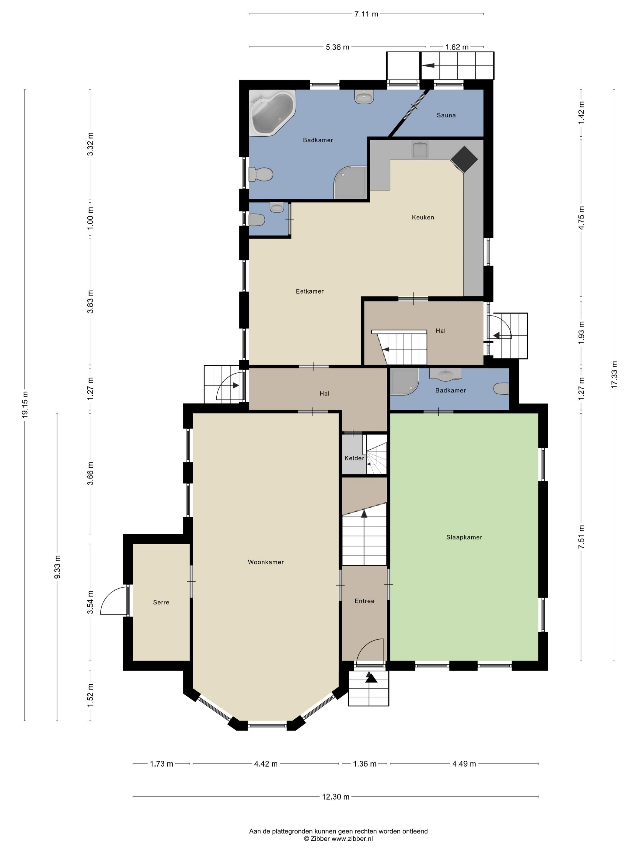 Entree/ruime hal met trapopgang naar de verdieping, woonkamer van ca. 52 m² met aangebouwde serre, gang, achterhal, woonkeuken met modern keukenblok voorzien van diverse inbouwapparatuur, toilet met fonteintje, grote badkamer met douchecabine, ligbad, sauna, wastafel en toilet, slaapkamer van ca. 33 m² met aangrenzende badkamer met wastafelmeubel en toilet.