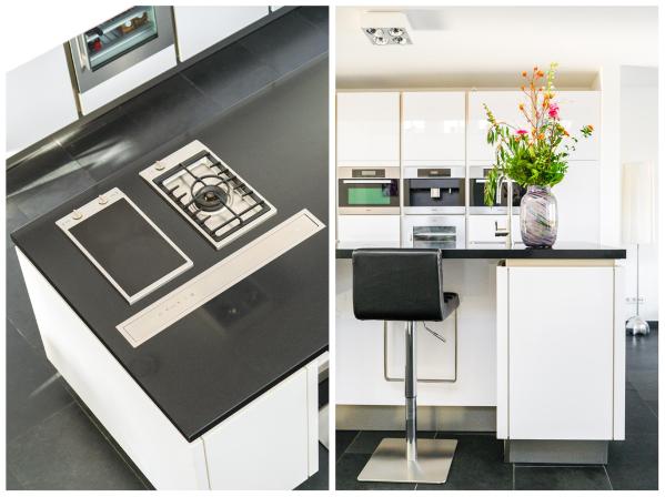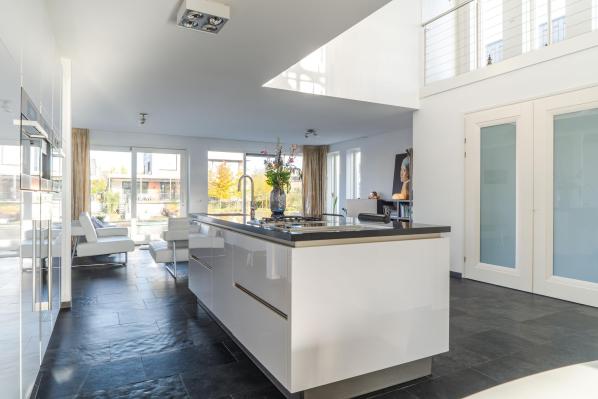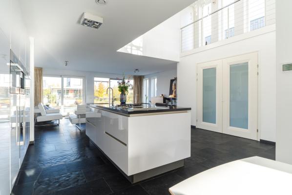 Entree/hal, wandcloset met fonteintje, grote bijkeuken met veel bergruimte, trapopgang, royale lichte living welke grenst aan het water met schuifpui naar de achterliggende steiger en een schuifpui naar de tuin met terras, zeer complete en volledige luxe SieMatic keuken met vele extra's zoals een koffieapparaat, wijnkoeler en stoom- en combi-oven, werkkamer (ca. 11 m²) met dubbel openslaande deuren naar de woonkamer.