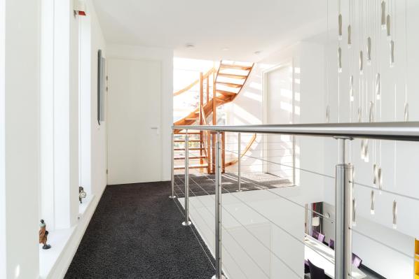 Overloop, slaapkamers 3 en 4 (ca. 11 en 7 m²), tweede badkamer (ruimte en voorbereiding aanwezig), technische ruimte en een balkon (ca. 10 m²)