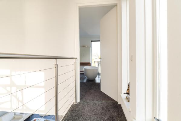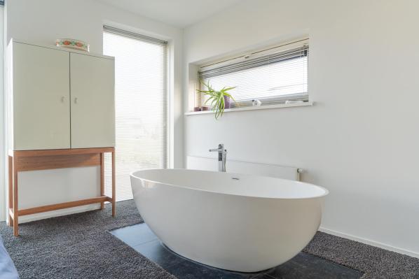 Ruime lichte overloop, royale master bedroom (ca. 32 m²) met uitzicht op het water, vrijstaand bad en walk-in-closet, moderne badkamer voorzien van inloopdouche, dubbele wastafel en wandcloset, slaapkamer 2 (ca. 10 m²), was- en bergruimte.