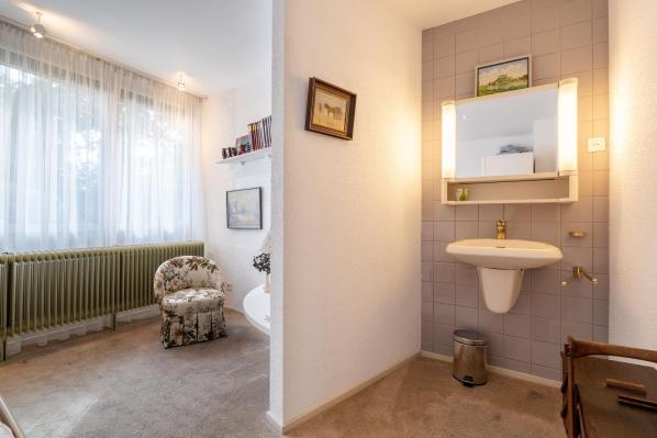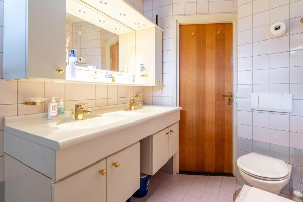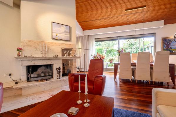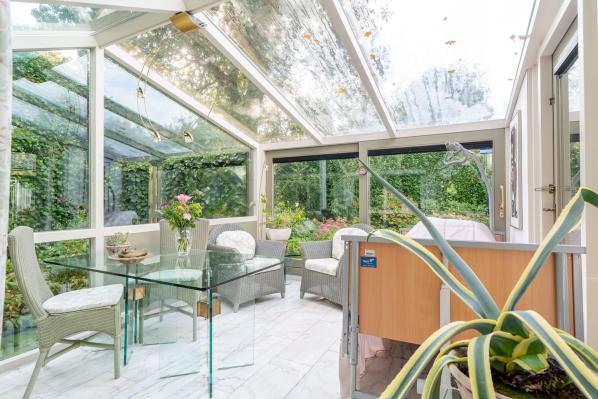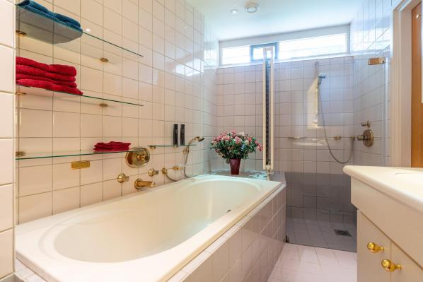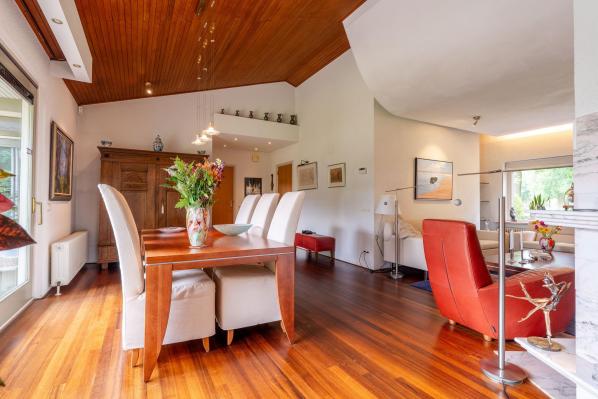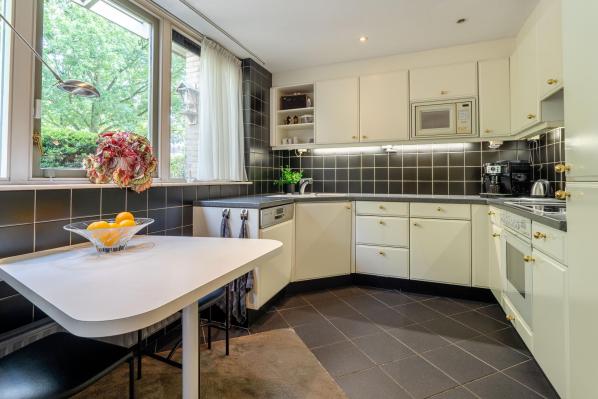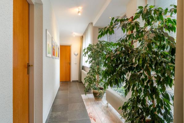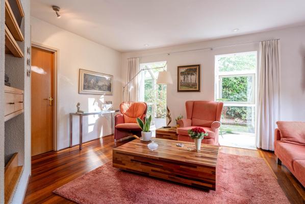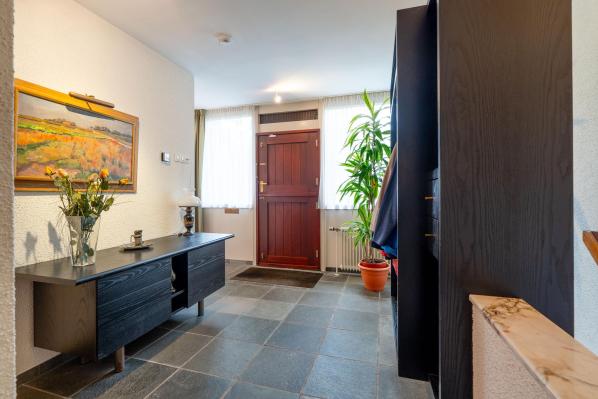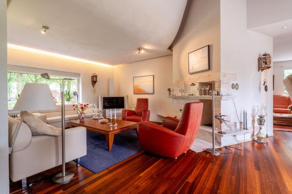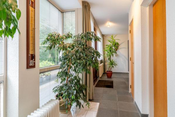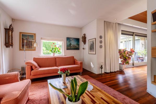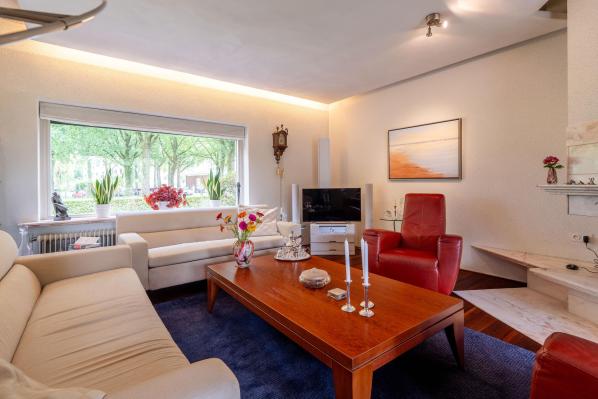 Entree/ruime hal met toegang naar de kelder en garderobe, toilet met fonteintje, royale lichte living met open haard en schuifpui naar de achtertuin, tuinkamer, dichte keuken voorzien van diverse inbouwapparatuur, bijkeuken, werkkamer, 2 slaapkamers, waarvan de master met naastgelegen badkamer voorzien van douche, ligbad, dubbele wastafel en toilet.