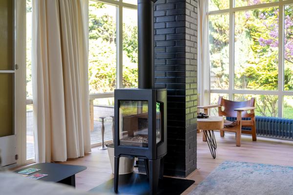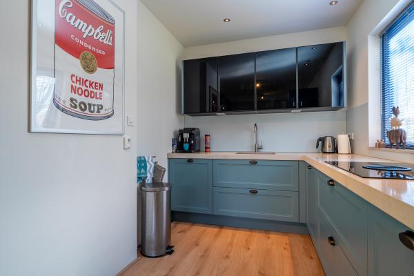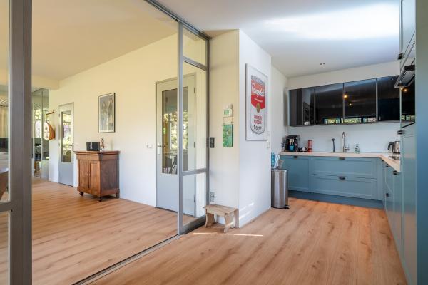 Entree/hal met vide, toilet, royale en lichte woonkamer met houtkachel, eetkamer, moderne keuken uit 2024 met diverse inbouwapparatuur, werkkamer, slaapkamer met naastgelegen badkamer met douche en wastafel.