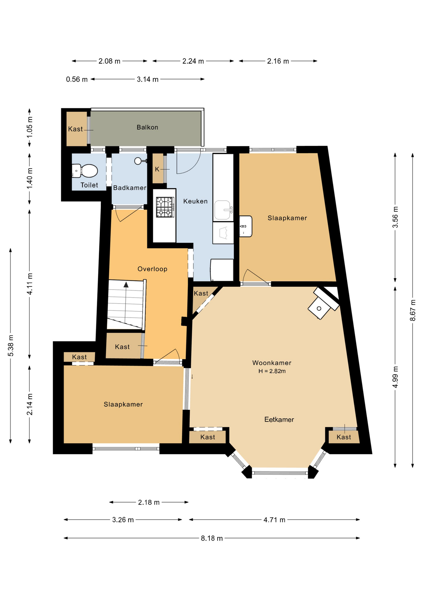 Overloop, bergruimte, gezellige woonkamer met erker, vaste kasten en schouw, dichte keuken voorzien van enige inbouw apparatuur, 2 slaapkamers, badkamer met douche en toilet