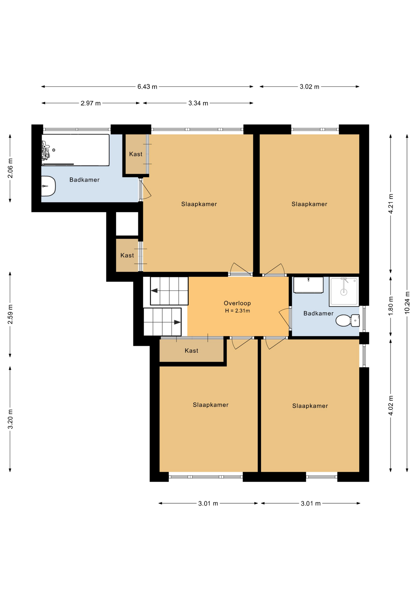 Overloop, 4 slaapkamers, waarvan de master bedroom met inbouwkasten en badkamer met ligbad/douche en wastafel, 2e badkamer met douche, wastafel en toilet.