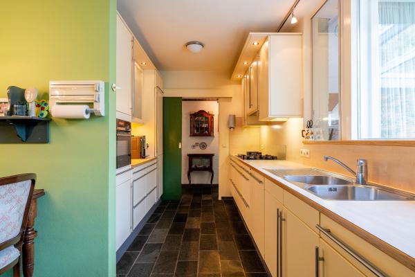 Entree/hal met trapopgang, toilet met fonteintje, L-vormige living met twee schuifpuien naar de tuin, dichte keuken voorzien van diverse inbouwapparatuur, bijkeuken met witgoedaansluiting en toegang naar buiten.