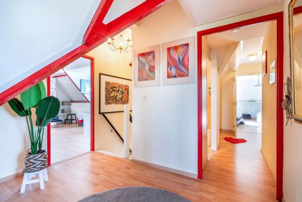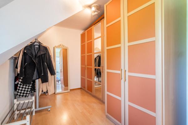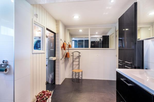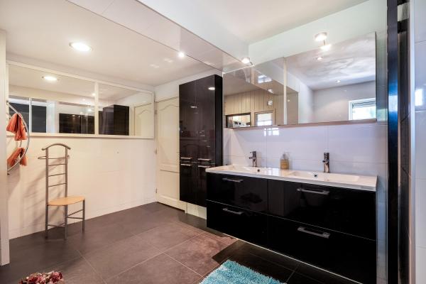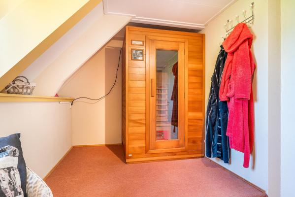 Overloop, 4 slaapkamers, waarvan de grootste met walk-in-closet, 2e badkamer met douche, wastafel en sauna, separaat toilet met fonteintje.