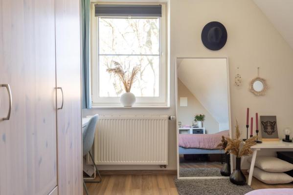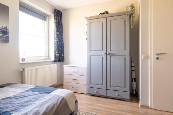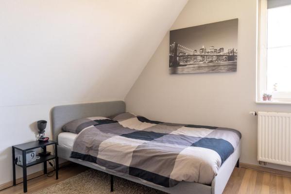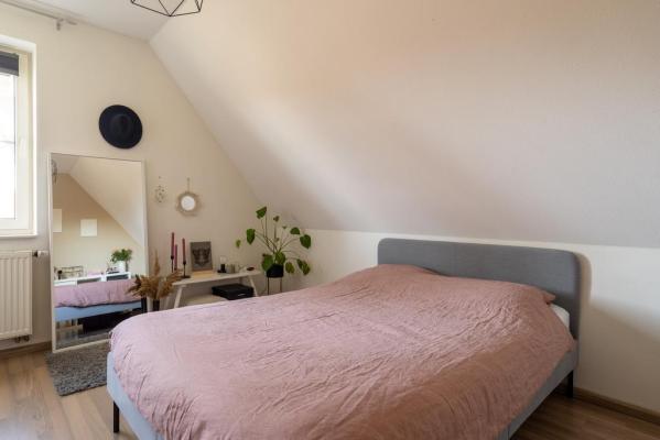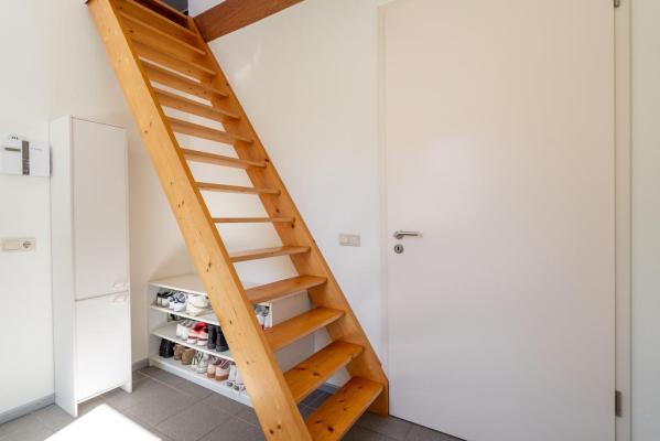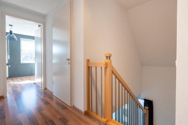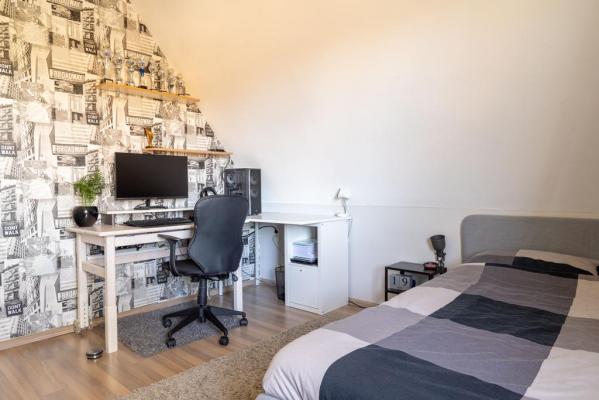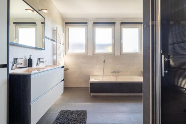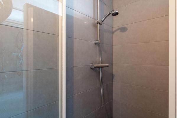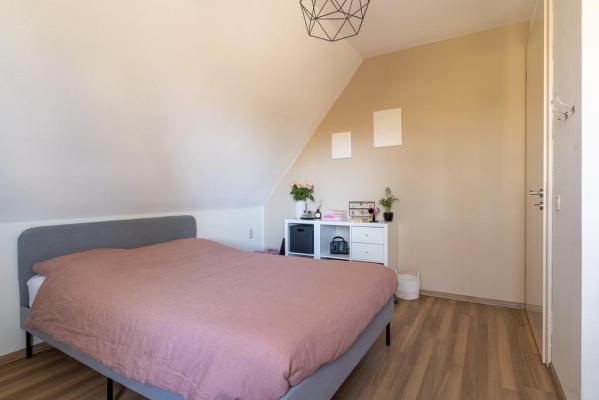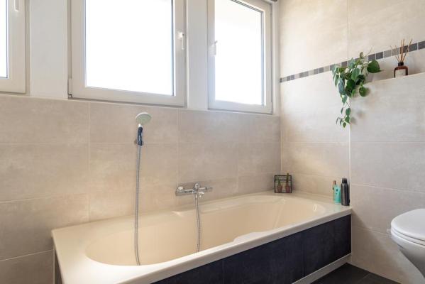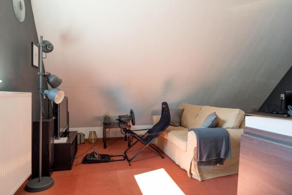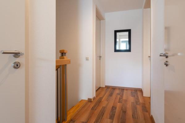 Overloop, 4 slaapkamers, badkamer met douche, ligbad, wastafelmeubel en toilet. Vaste trap naar zolder (voor berging en/of extra slaapkamer)