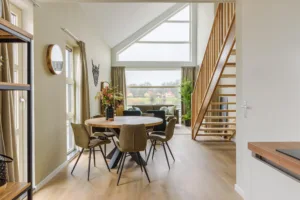 Binnen wacht een royale en lichte woonkamer met grote raampartijen, een speelse indeling en een moderne open keuken. Hier geniet u dagelijks van het weidse uitzicht over het water en de natuur. De begane grond biedt twee comfortabele slaapkamers en een stijlvolle badkamer. De verdieping beschikt over een royale overloop, een derde slaapkamer en een tweede badkamer. Ideaal voor gasten of een groter gezin. Ook op het gebied van duurzaamheid is dit een toekomstbestendige investering: uitstekende isolatie (gemiddelde RC-waarde 6.2) en onderhoudsarme Keralit gevelbekleding zorgen voor zorgeloos woongenot. Buiten vormt de tuin aan het water een oase van rust en ontspanning.
