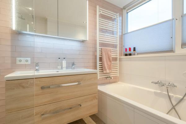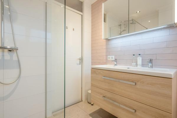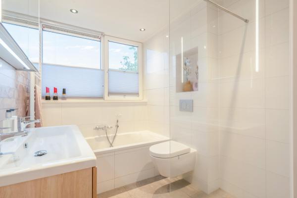 Overloop, 3 slaapkamers, badkamer met douche, ligbad, dubbele wastafel en toilet.