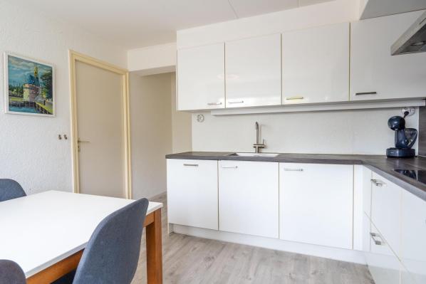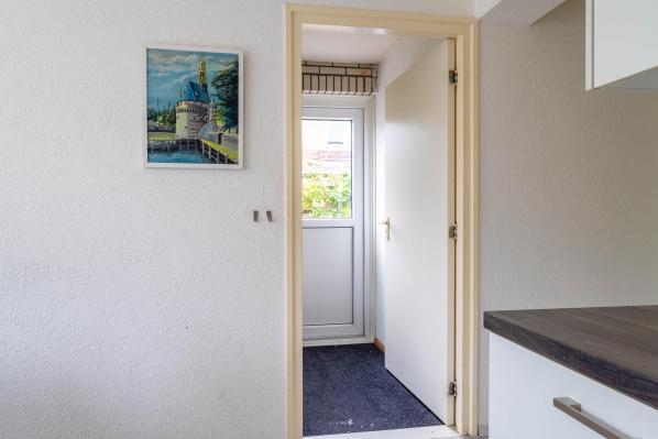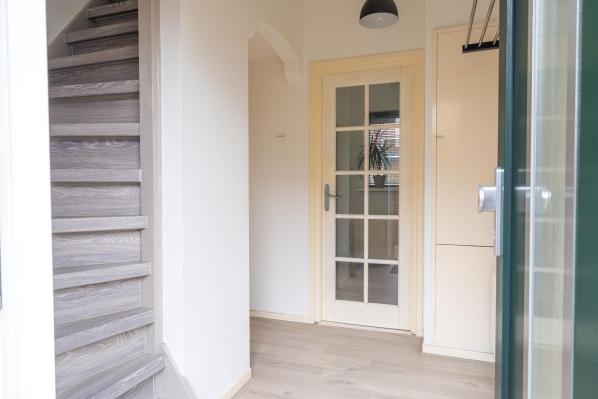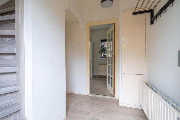 Entree/hal met trapopgang en toegang tot kelder, toilet met fonteintje, L-vormige living, dichte moderne keuken voorzien van diverse inbouwapparatuur, bijkeuken met witgoedaansluiting en toegang naar buiten.